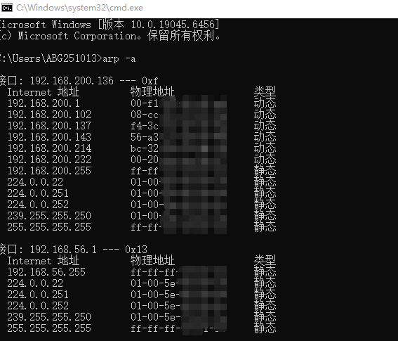 在CMD中输入 arp -a 命令,这会列出本地ARP缓存表。