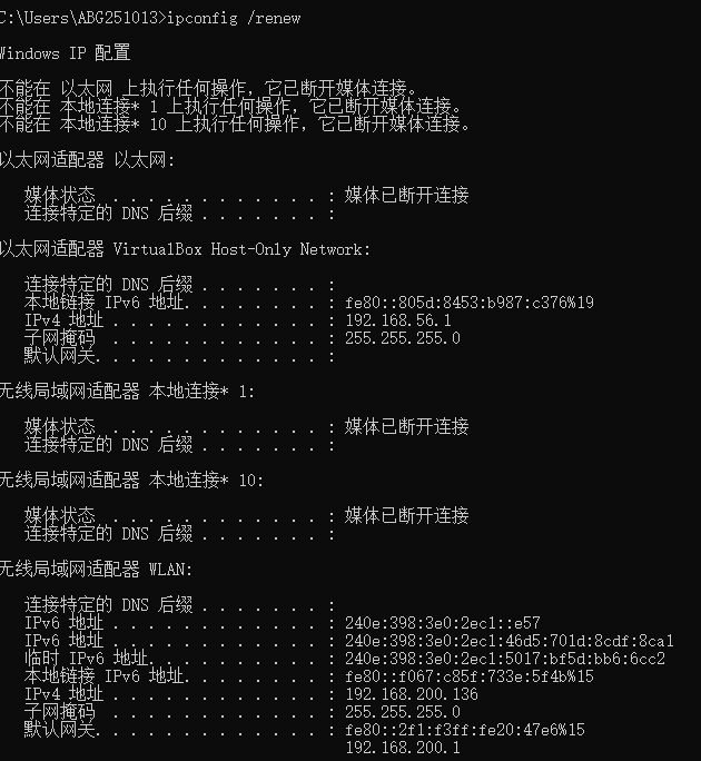 ipconfig /renew是更新,相当于向DHCP说:给我一个新的IP,网络会重新连接上。