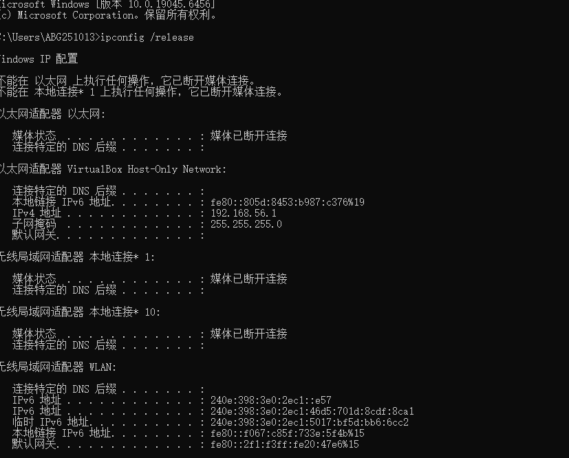 ipconfig /release是释放,相当于向DHCP说:我不要IP地址了,网络会断开。