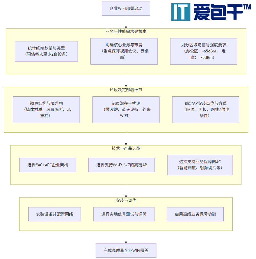 对于50人以上的企业,扩大WiFi覆盖面积不仅仅是增加几个路由器那么简单。与家庭网络不同,企业网络需要在高密度、多并发的情况下,保障所有员工办公应用(如视频会议、云桌面)的稳定、高速和低延迟。以下是爱包干™为企业制定有效解决方案的核心步骤,方案较为通用,针对不同网络应用场景,可咨询爱包干™给出更精准的网络解决方案。