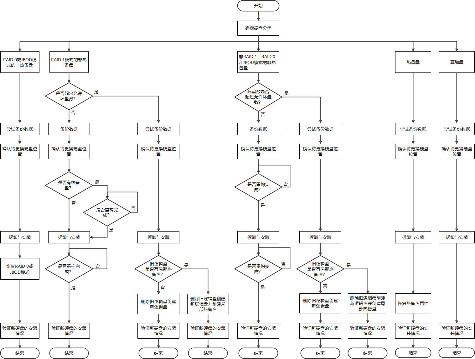 下图为华为TaiShan 200 服务器更换硬盘流程图,核心流程(断电、拔插、上电验证)与戴尔、HPE等品牌是相通的。管理工具和具体操作细节上存在品牌差异。